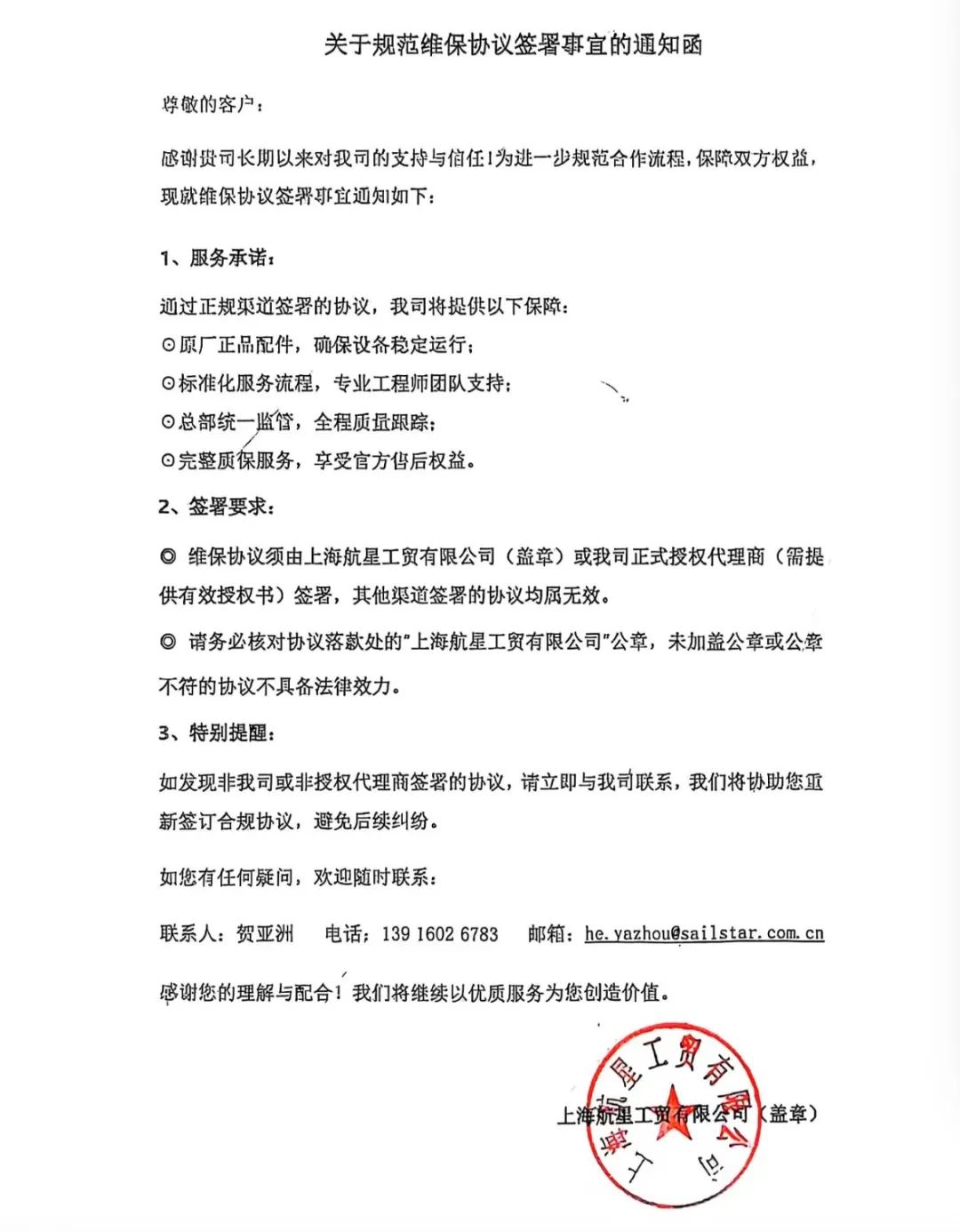 每一位选择航星设备的客户,都是我们前行路上的重要伙伴。我们深知,维保服务的规范性不仅关系到设备的稳定运行,更承载着大家对航星的信任。若您在维保协议签署过程中有任何疑问,欢迎随时与我们沟通,我们将第一时间为您提供协助。再次感谢您的理解与支持,期待与您继续携手,共创更稳定、更高效的合作环境!